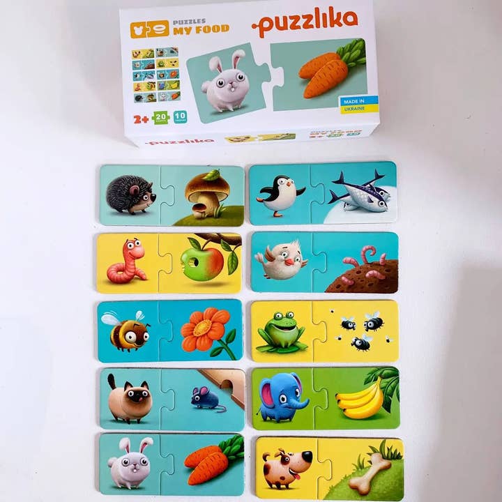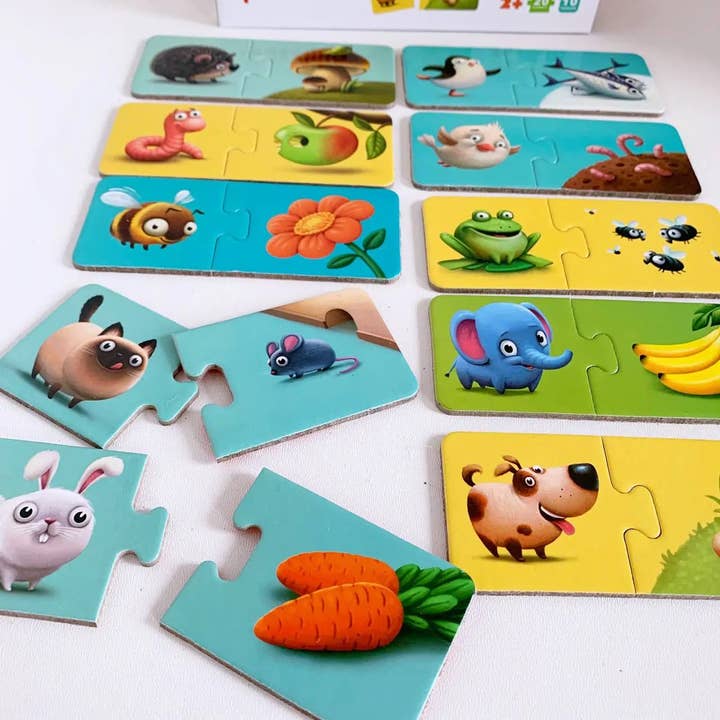 Az ételek témája gyakorlatiassá teszi ezt a puzzle-t – a gyerekek játék közben megismerik a különböző ételeket, és szókincsük bővül. A 20 darab pont megfelelő nehézséget ad.